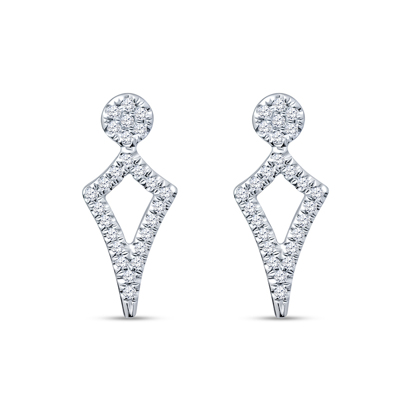 14k white gold earrings, 1.21gr set with 52 round brilliant diamonds totaling 0.11tct. The design features a sparkling circular top and an elegant open-diamond–shaped drop for a modern, refined look.