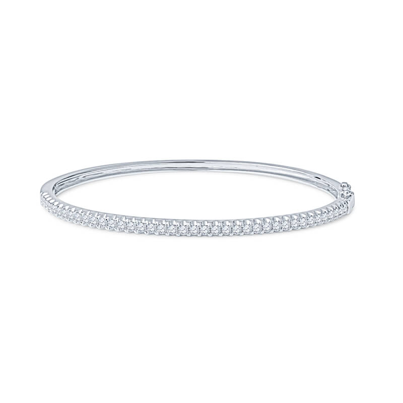 A sleek, modern 14K white gold bangle featuring 39 Ideal cut round diamonds totaling 1.01ctw, gracefully set along its flowing curve for a brilliant, contemporary look. Available in Rose gold.