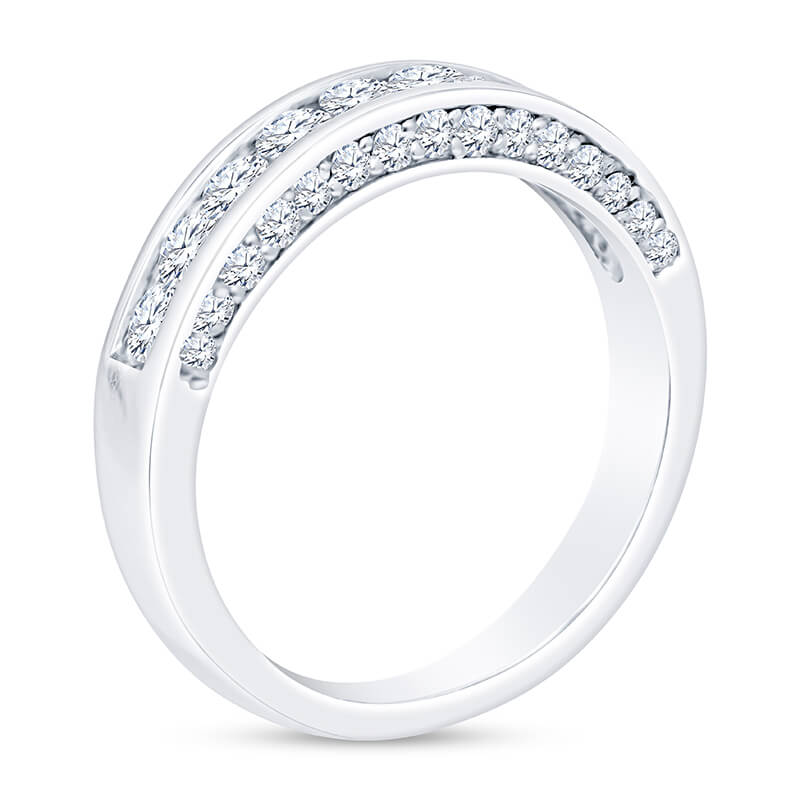 A classic 18k white gold band channel set with 10 Round diamonds weighing 0.81ctw. and 15 Round diamonds weighing 0.10ctw. on each side.