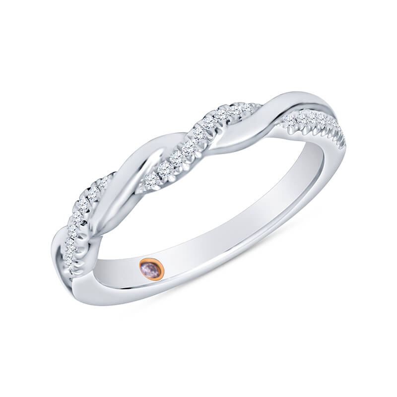 This 18K white gold band, weighing 3.67 grams, features an elegant twisted design accented with 34 round brilliant diamonds totaling 0.14 TCT and a hidden 0.01 CT fancy pink diamond for a subtle, distinctive touch of luxury.