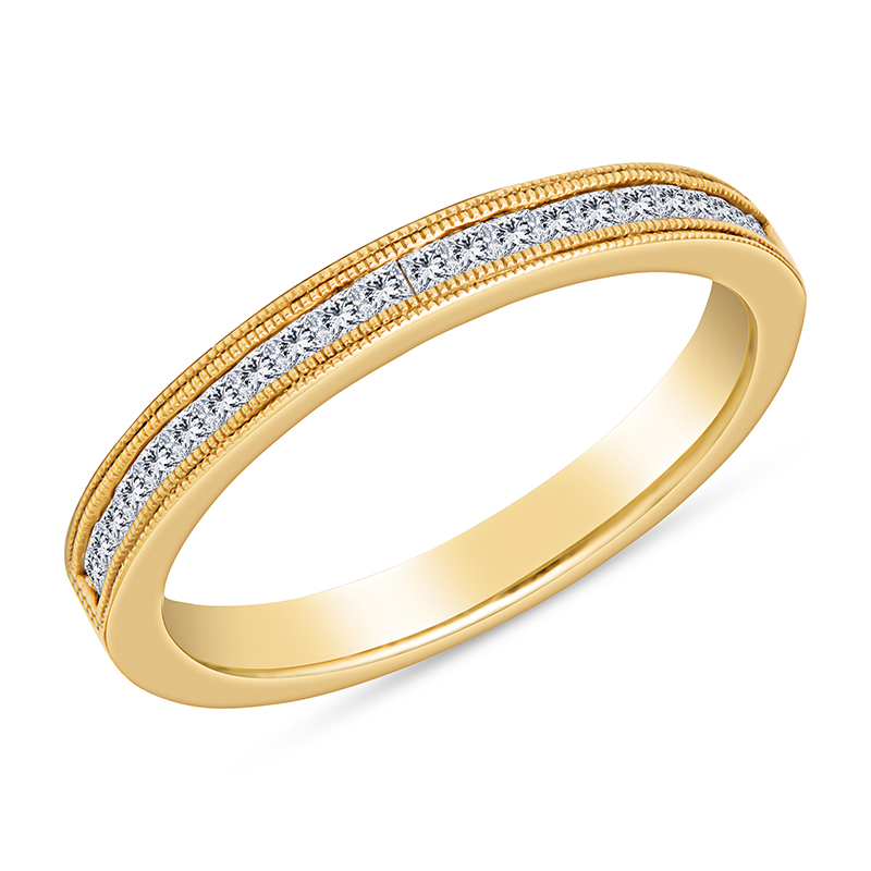 This 18k yellow gold band showcases 22 princess-cut diamonds totaling 0.30 carats in an elegant channel milgrain setting, weighing 2.91 grams for a refined vintage-inspired look.