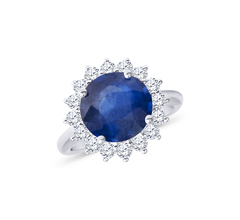 Effortlessly refined, this 14K white gold ring showcases a vivid round blue sapphire surrounded by a brilliant diamond halo, delivering timeless elegance with striking depth and brilliance.