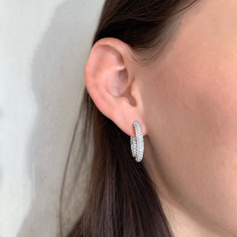 These 18k white gold micro pave diamond hoop earrings hold 158 round brilliant diamonds weighing 3.02ctw.