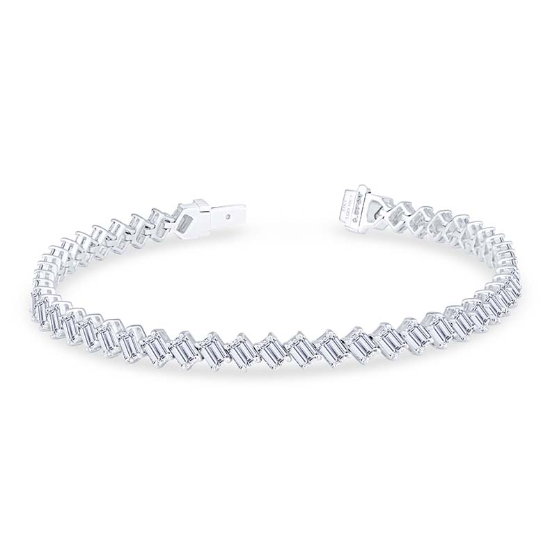 Sophisticated and striking, this white gold tennis bracelet features a seamless row of diagonally set emerald-cut diamonds designed for timeless elegance with a modern twist.