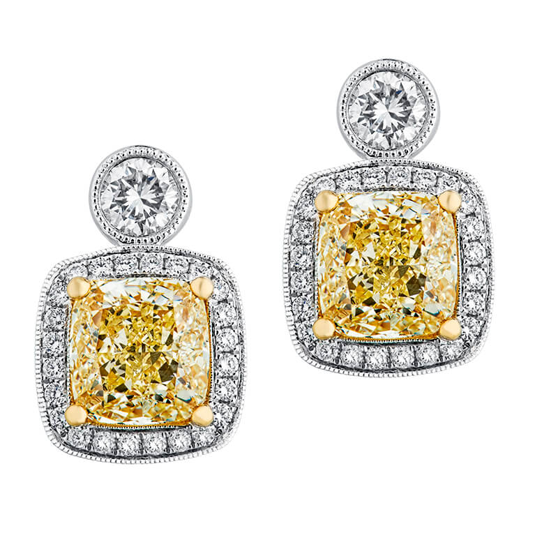 Two Round Brilliant 0.64tw H/VVS2 GIA excellent ideal cut diamonds form the post of these drop earrings, which each hold a gorgeous Fancy Yellow VS2 2.25ct canary diamond, surrounded by a halo of 0.36tw round cut white diamonds.
