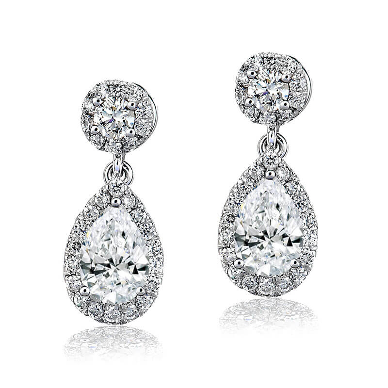Alluring 14K white gold diamond earrings set with 2 Pear shape diamonds weighing 2.03ctw D/SI2 GIA and 2 Round diamonds weighing 0.60ctw D/SI1 surrounded by a halo of 50 round diamonds weighing 0.75ctw.