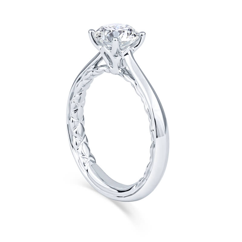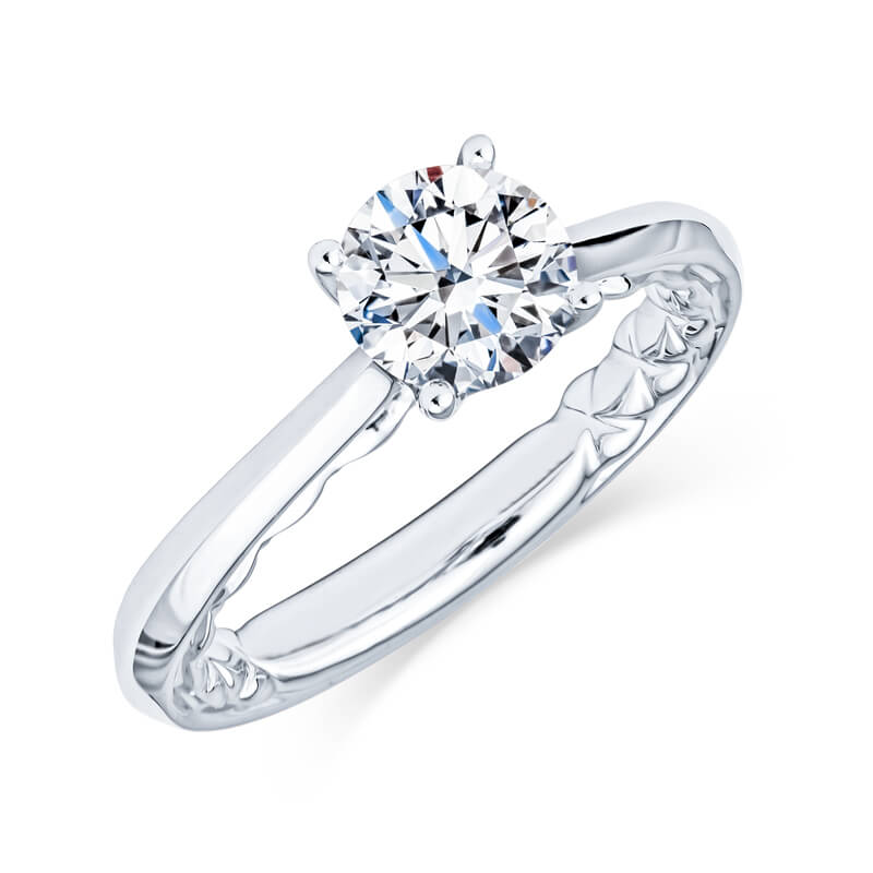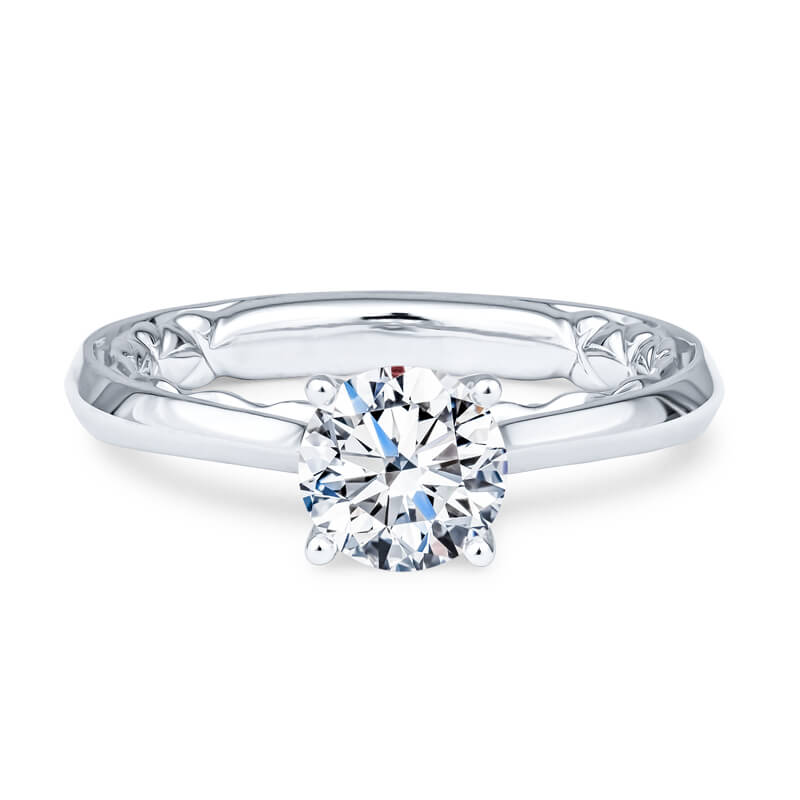 The gradual tapering of this elegant white gold solitaire enhaces a Round diamond.