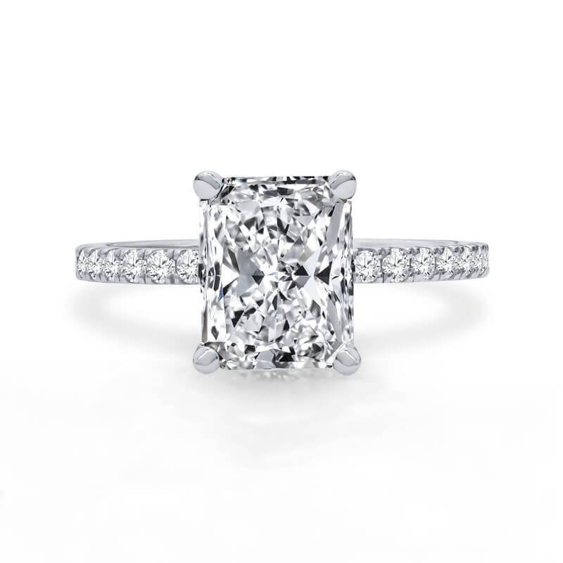 A stunning Pave’ shank highlights a engagement ring with a delicate hiden halo beneath an Ideal Cut Radiant Diamond.