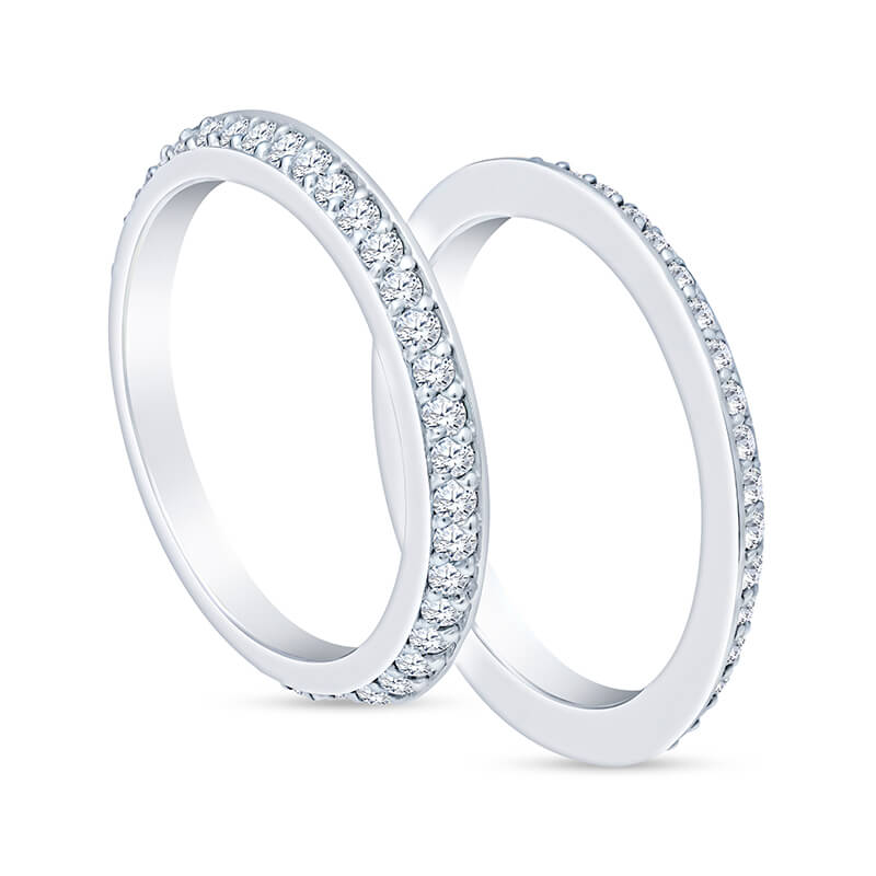 A stunning pair of 18K white gold double eternity bands featuring a combined 1.60ct of brilliant diamonds, offering continuous sparkle from every angle for a luxurious stacking or wedding set.