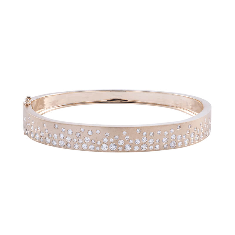 A stylish 14k Yellow gold bangle set with 95 round diamonds weighing 2.15ctw.