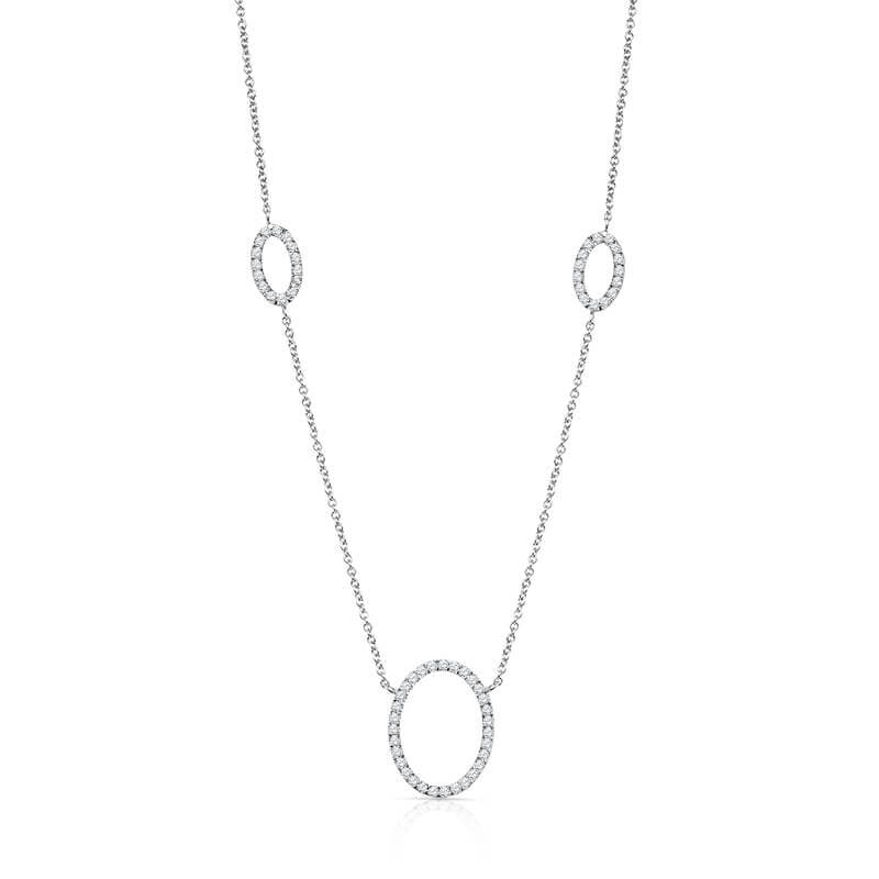 A modern 18k white gold fashion necklace of three oval hoops set with 61 round diamonds weighing 0.51ctw.