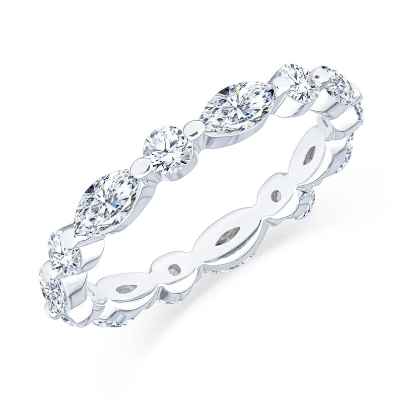 A beautiful floating shared prong 14k white gold eternity band set with 8 Round Cut Diamonds 0.25ctw alternating with 8 Marquise cut diamonds weighing 0.50ctw.