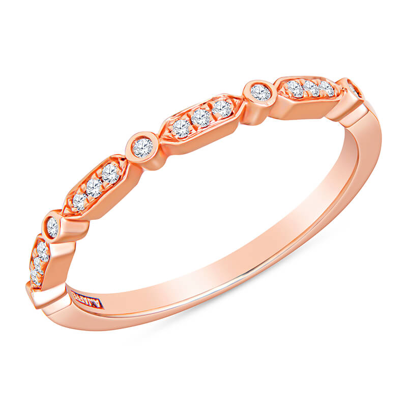 This 14k rose gold half eternity features 17 round brilliant diamonds totaling 0.09 carats and weighs 1.84 grams, designed with alternating bezel and bar-set details for a delicate, modern sparkle.